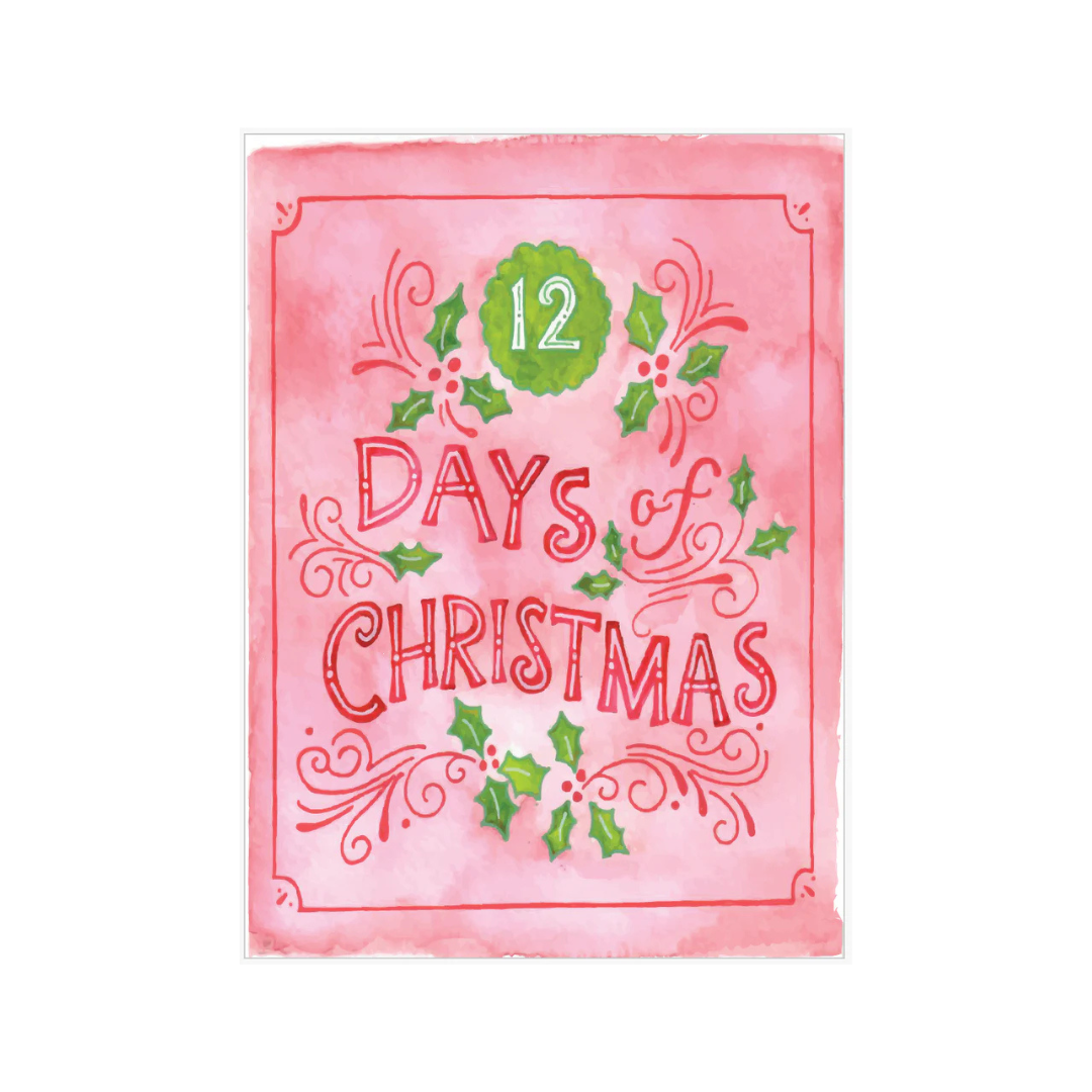 The set includes watercolor imagery of a partridge in a pear tree, two turtledoves, three French hens, four calling birds, five gold rings, six geese a-laying, seven swans a-swimming, eight maids a-milking, nine ladies dancing, ten lords a-leaping, eleven pipers piping, and twelve drummers drumming.