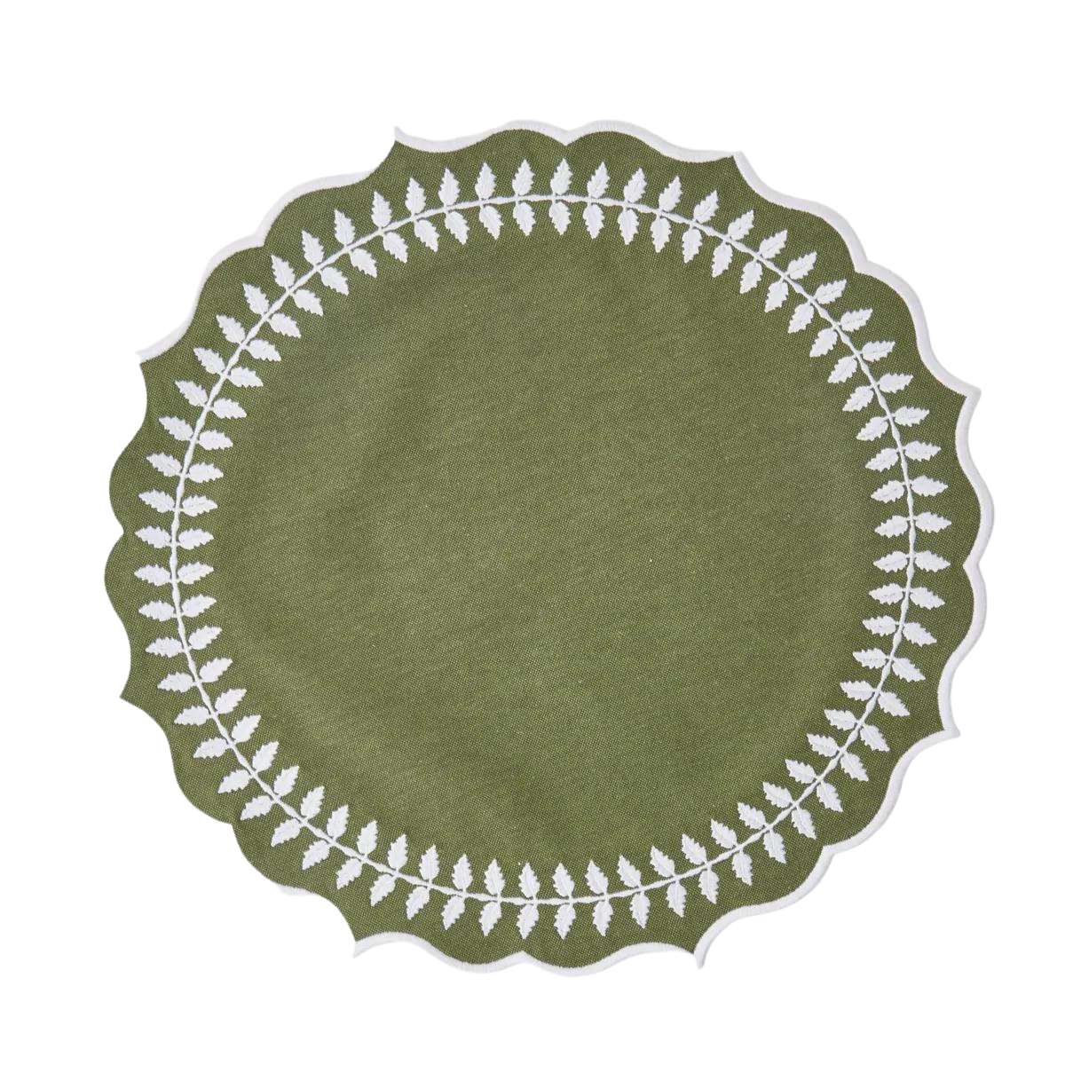 These round placemats are adorned with a beautiful white embroidered edge reminiscent of ferns.