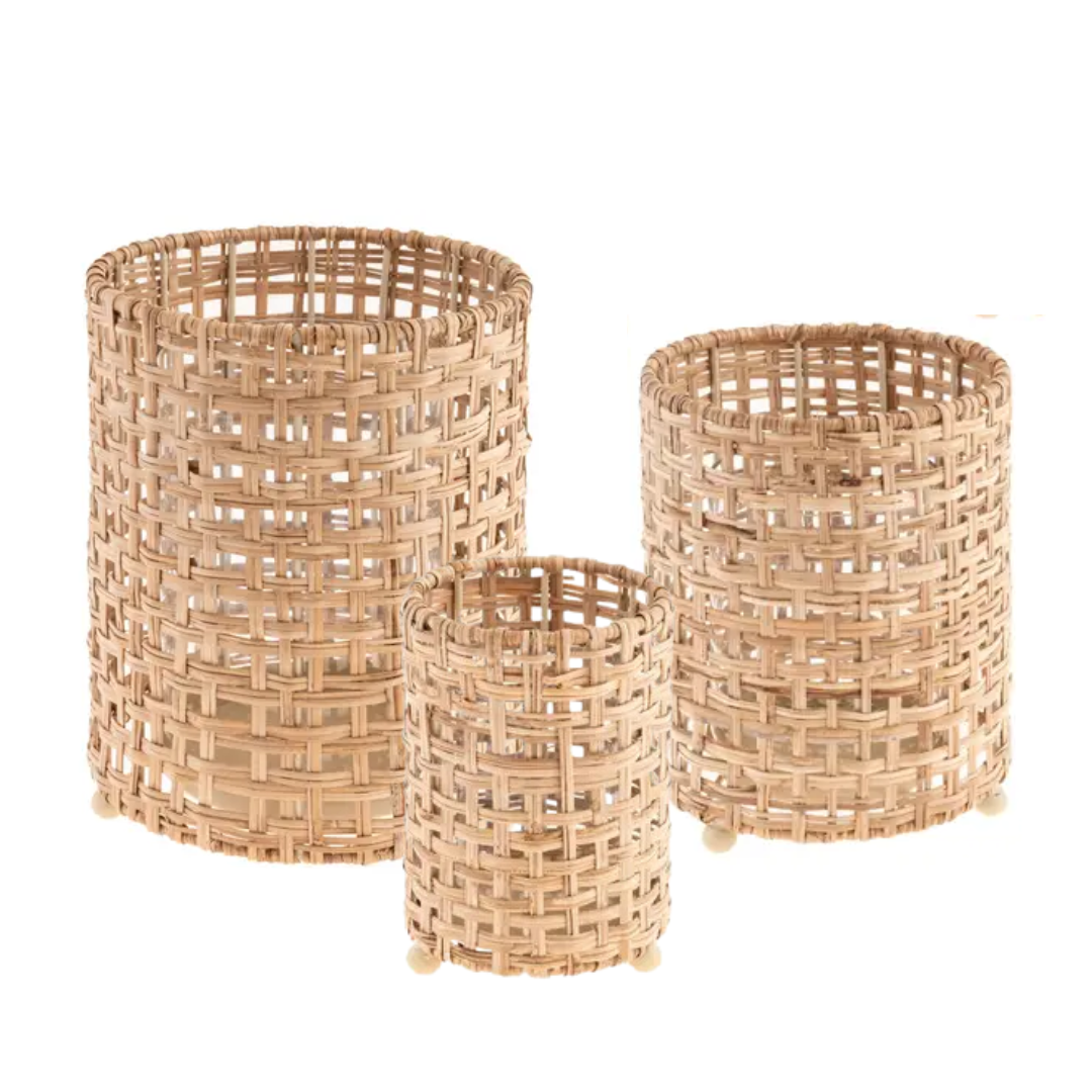This set of rattan hurricanes is perfect for candles, fresh greens, or your favorite blooms. Style them together or spread around your home.