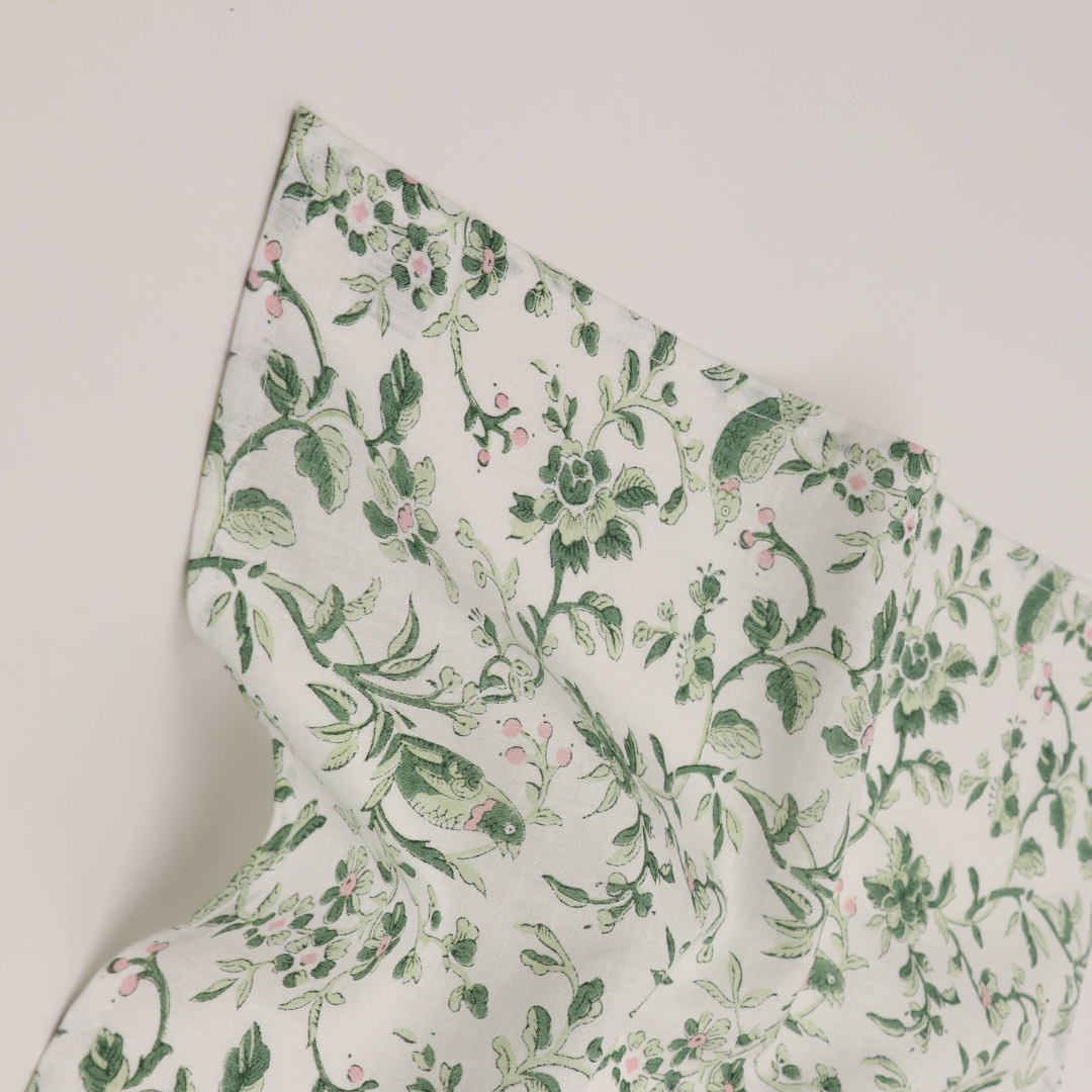 This blockprinted floral motif comes to life on 100% linen napkins through soft shades of pink and green.