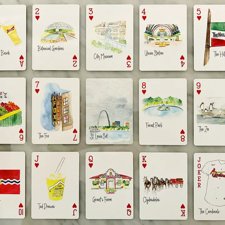These St. Louis, Missouri themed playing cards feature 15 unique watercolor images depicting the heart of St. Louis.